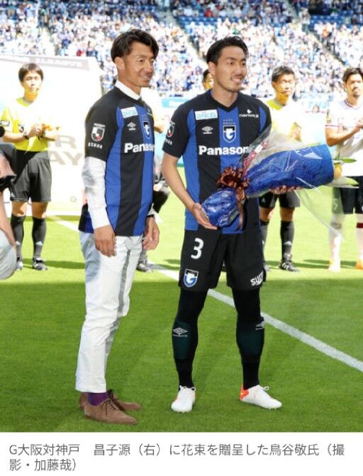 プロ野球阪神タイガースなどで活躍した鳥谷敬氏(40)が試合前、ガンバ大阪のDF昌子源(29)に花束を贈呈し、チームを激励した。